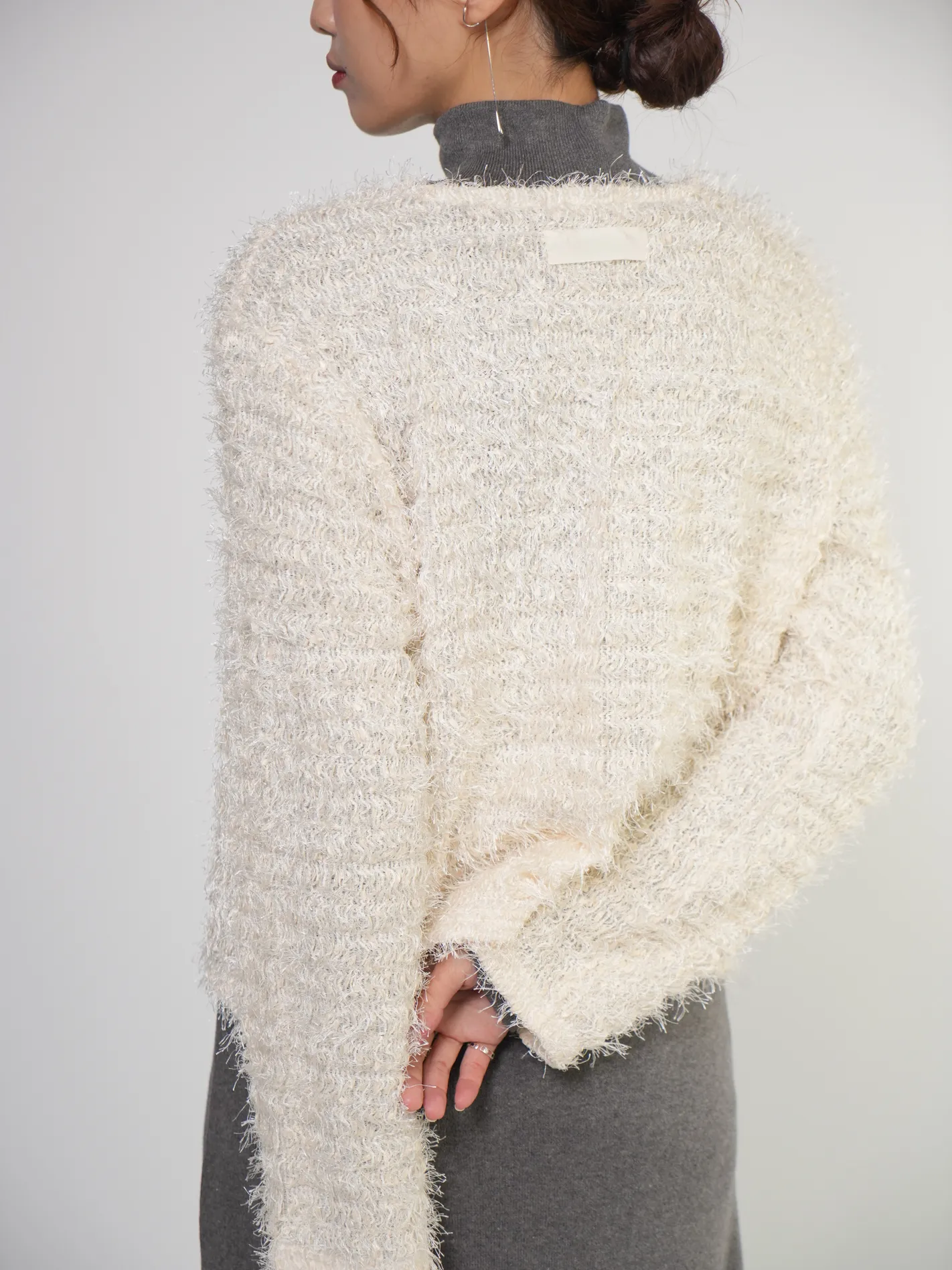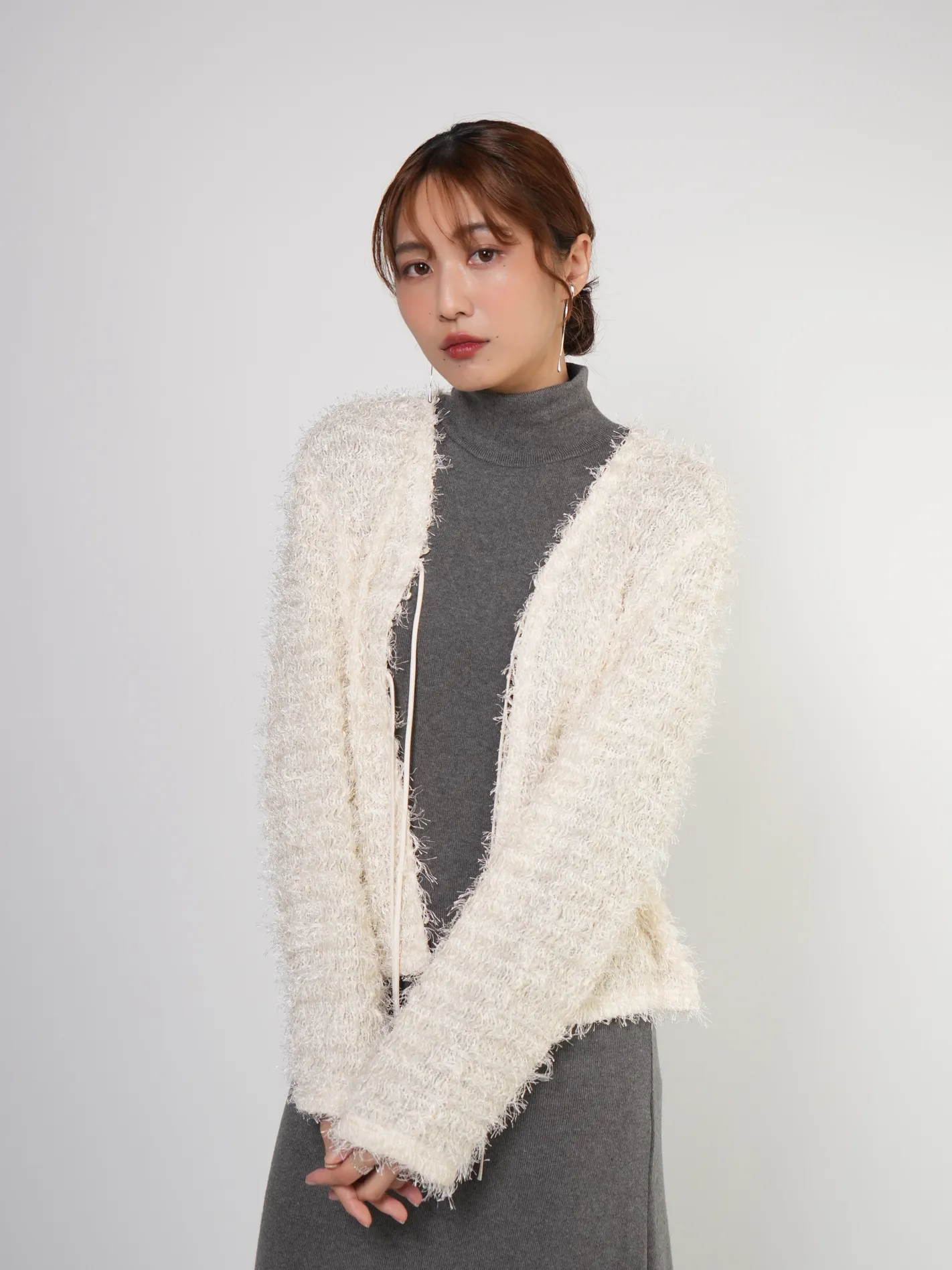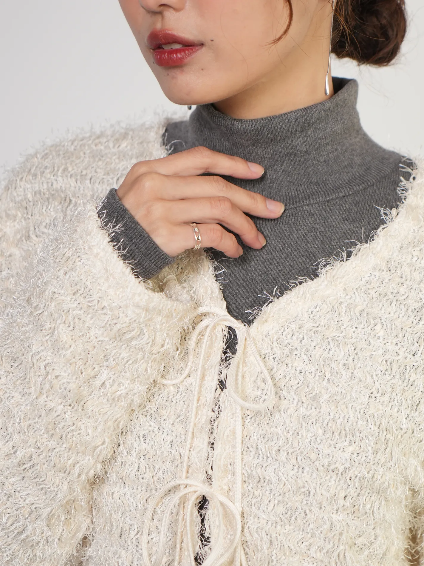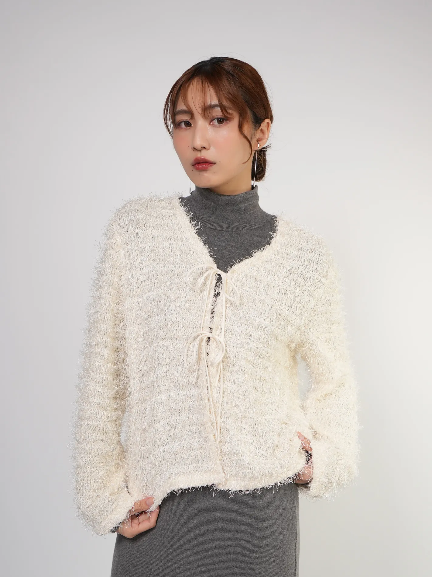 (限量現貨)毛絨圈圈紗綁帶開襟外套(米)