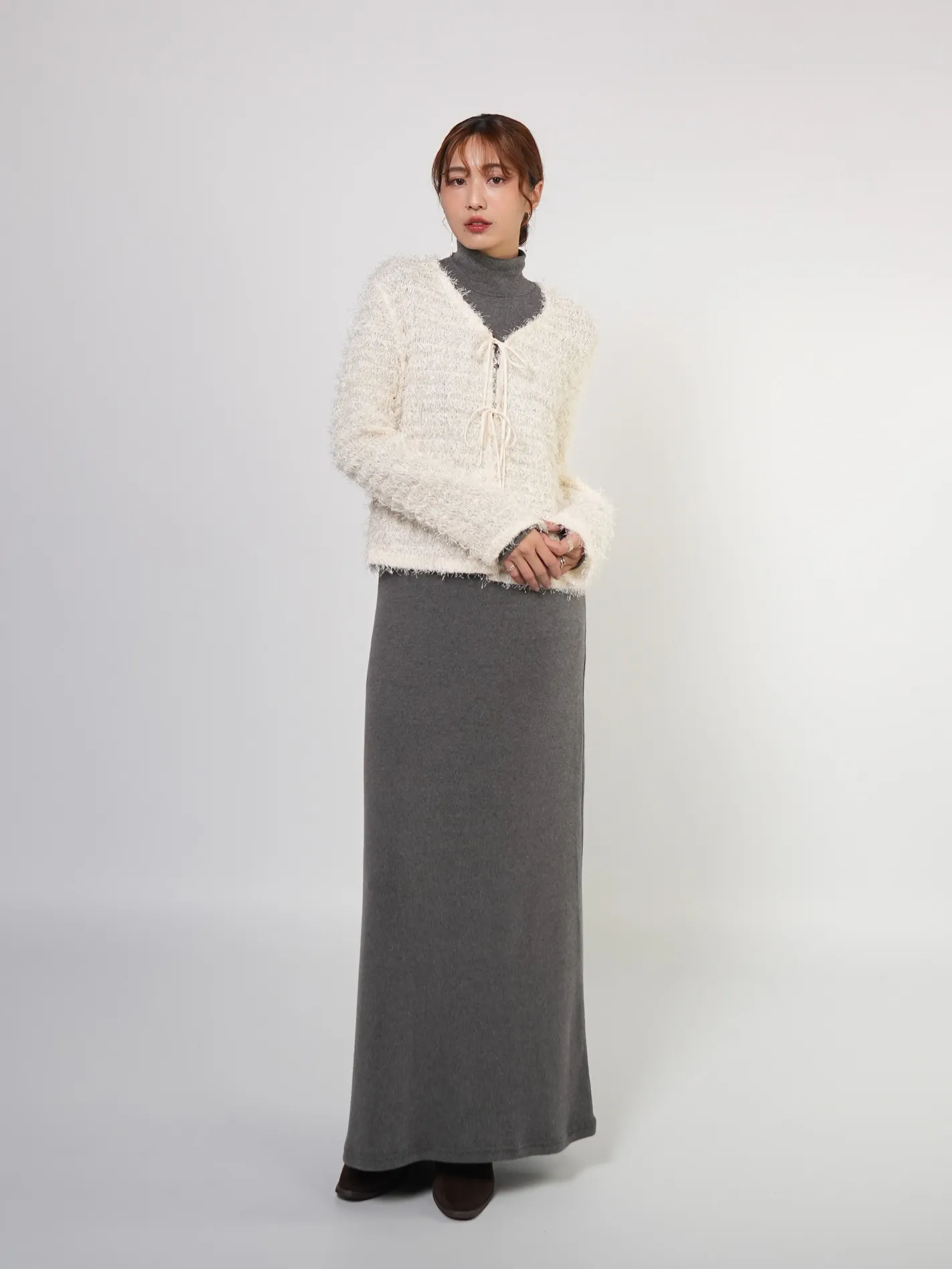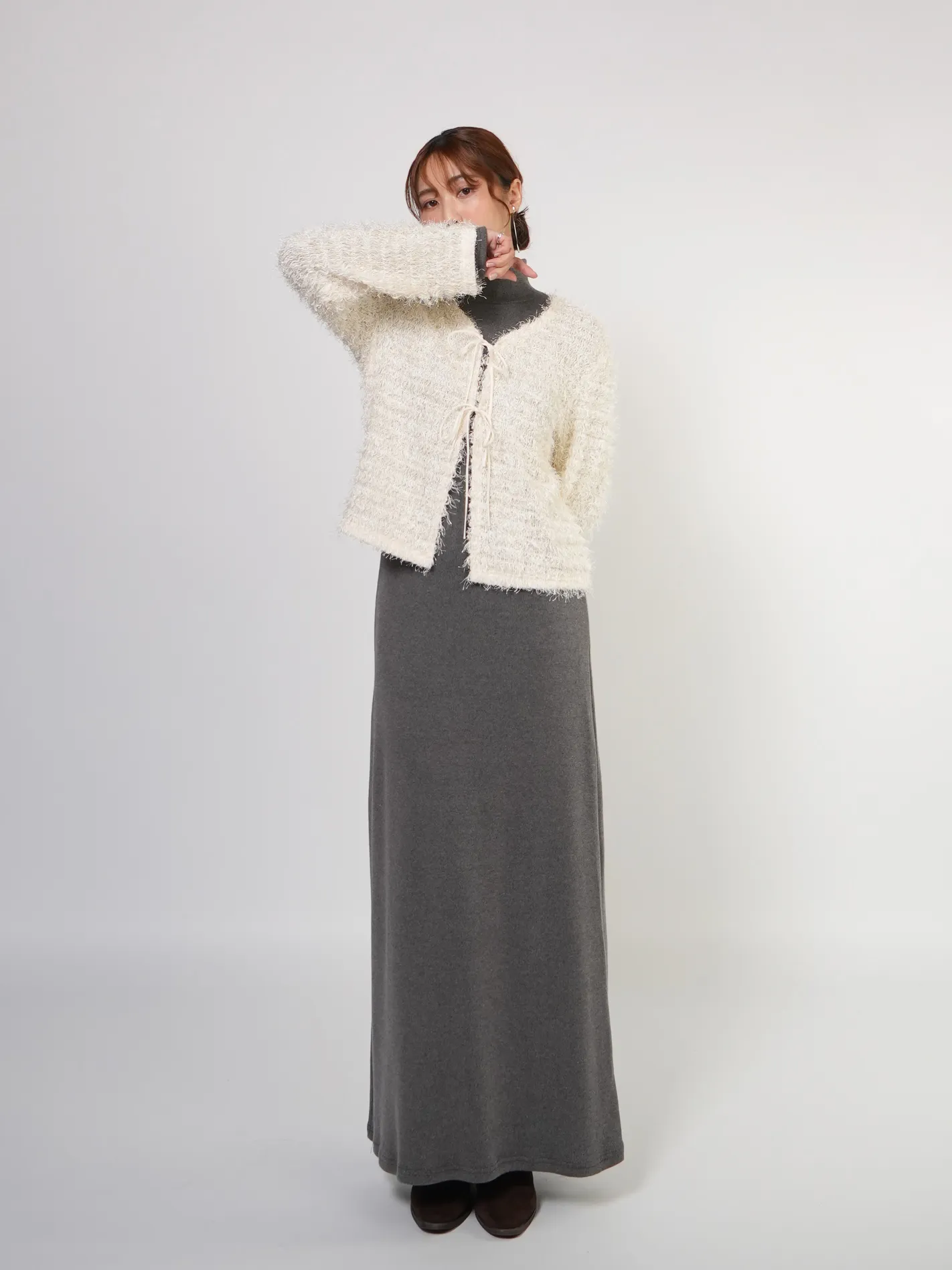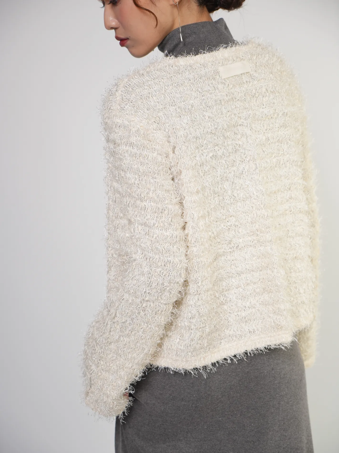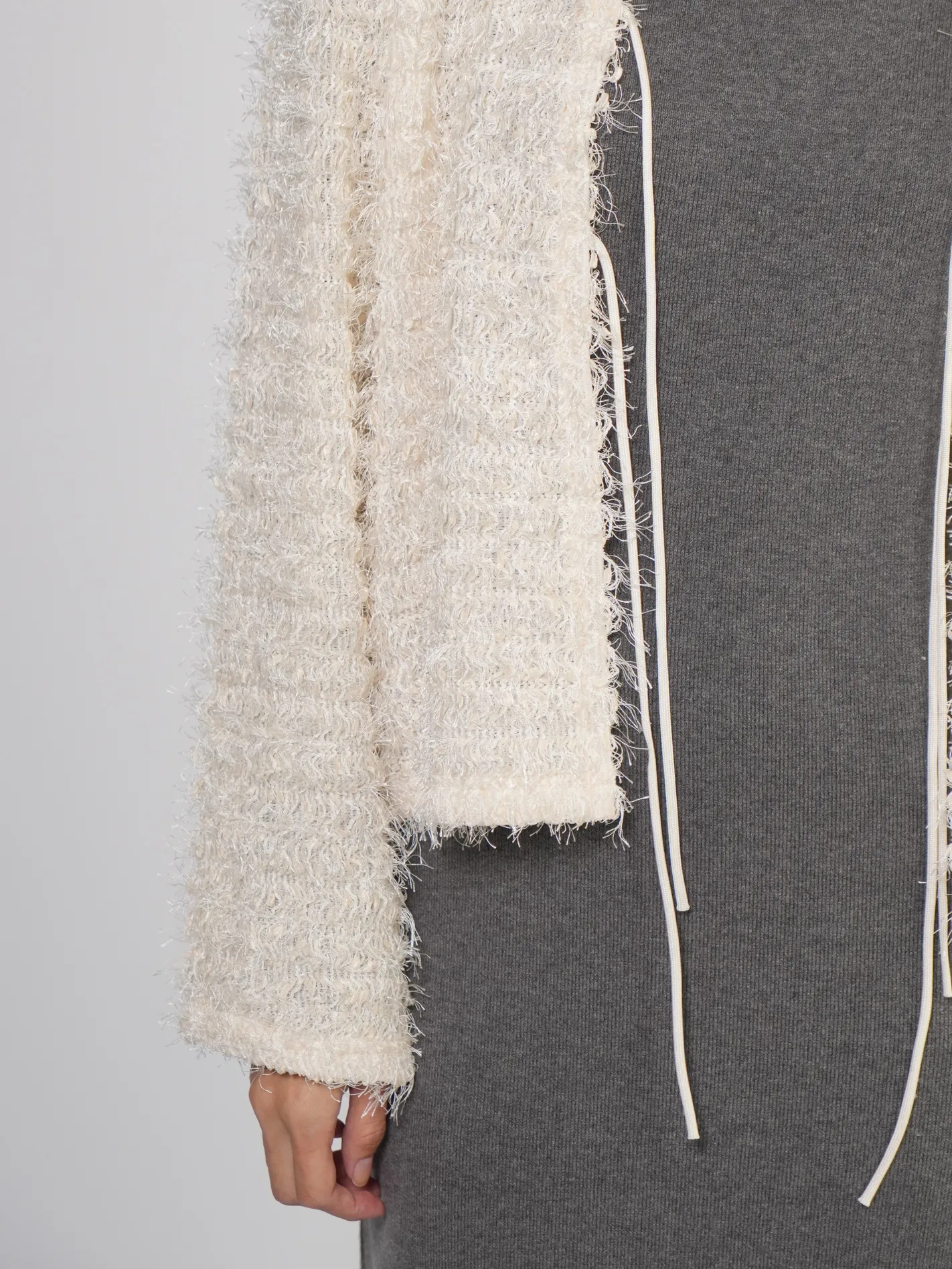 (限量現貨)毛絨圈圈紗綁帶開襟外套(米)