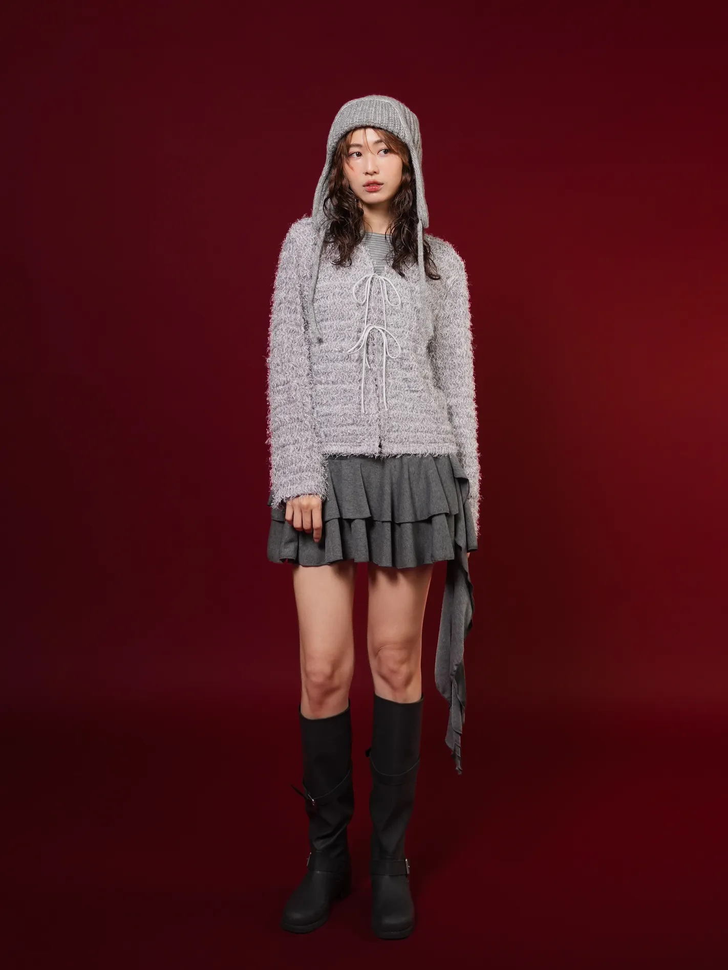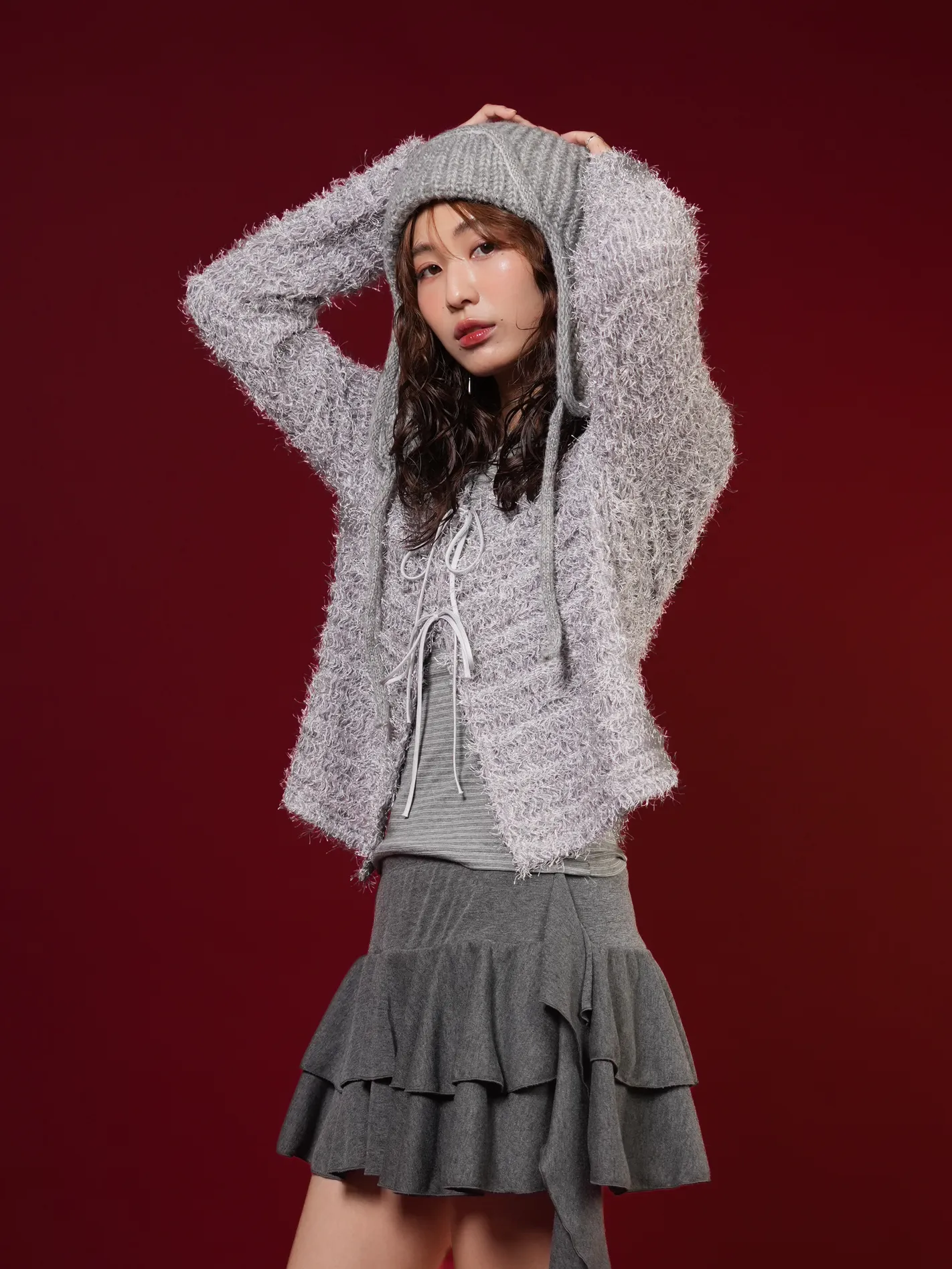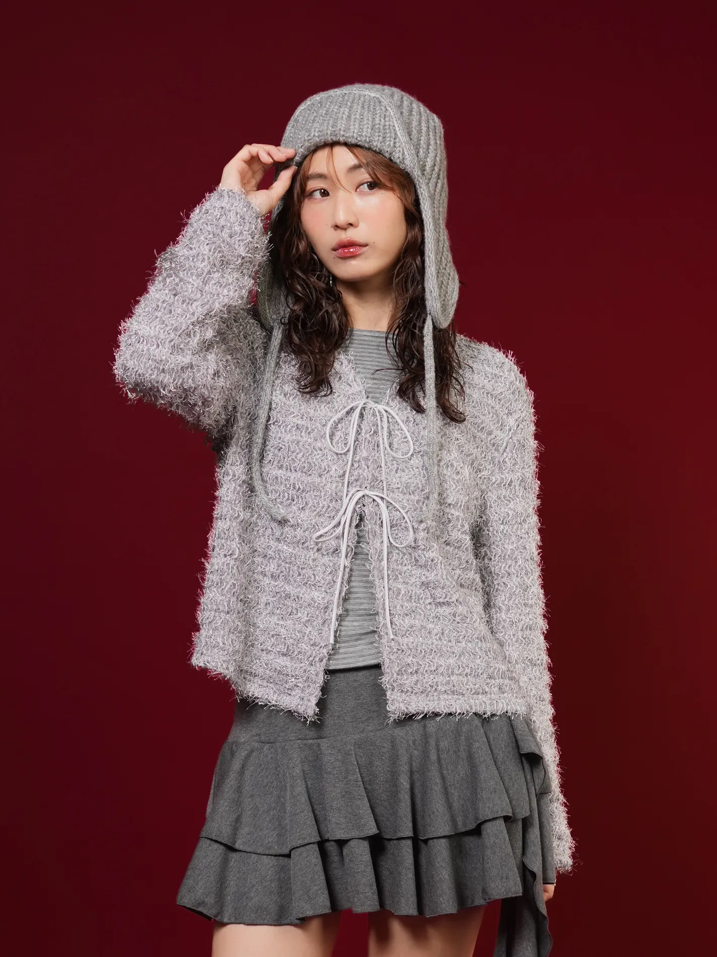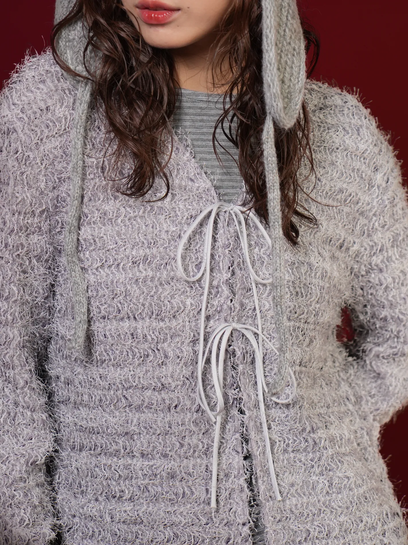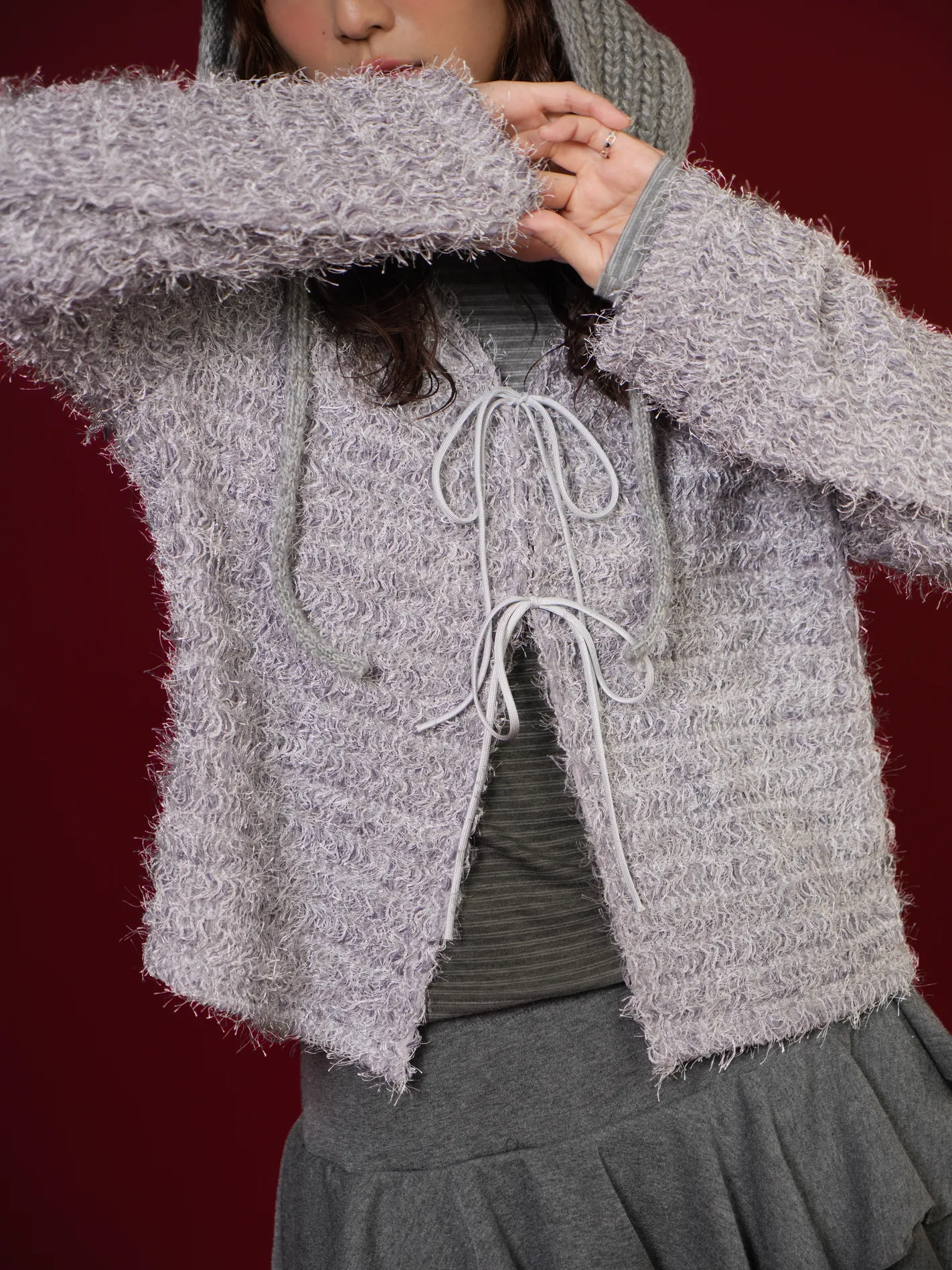 (限量現貨)毛絨圈圈紗綁帶開襟外套(灰)