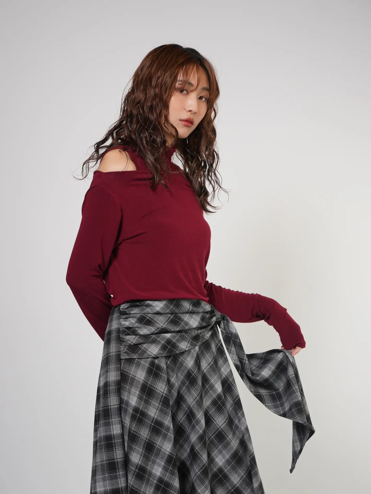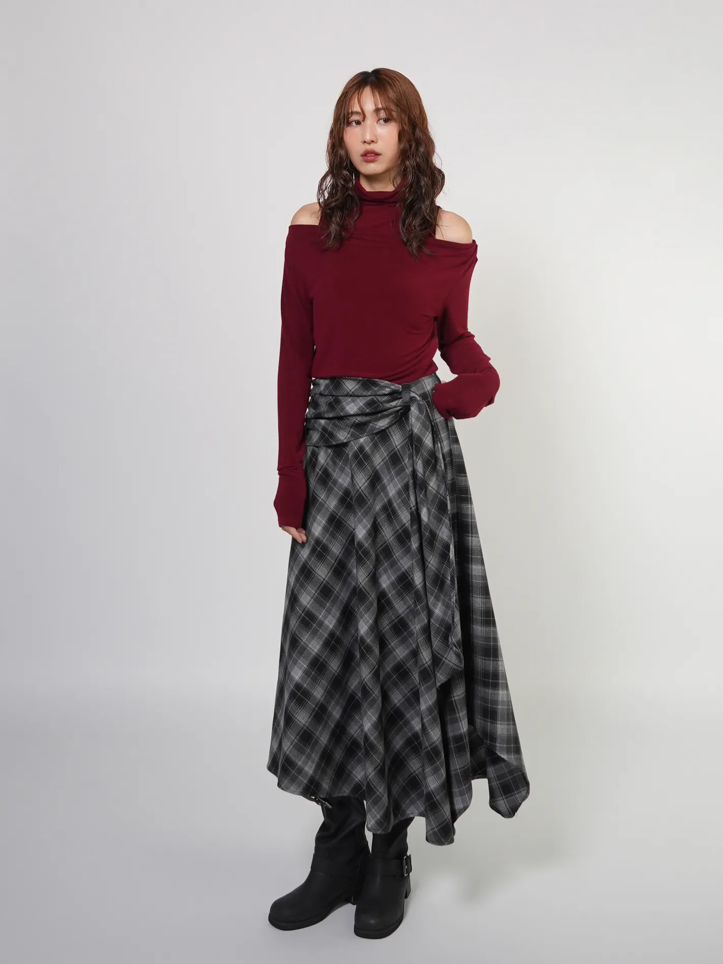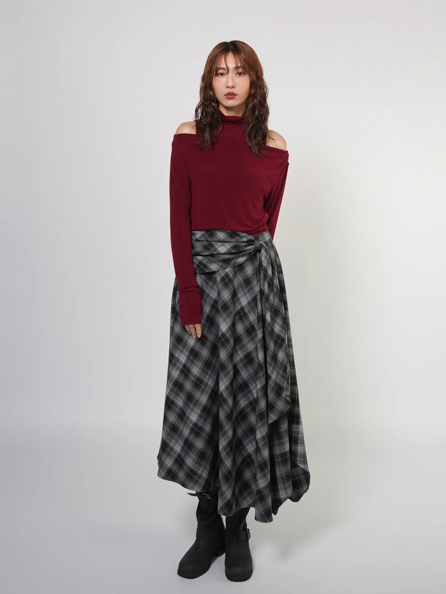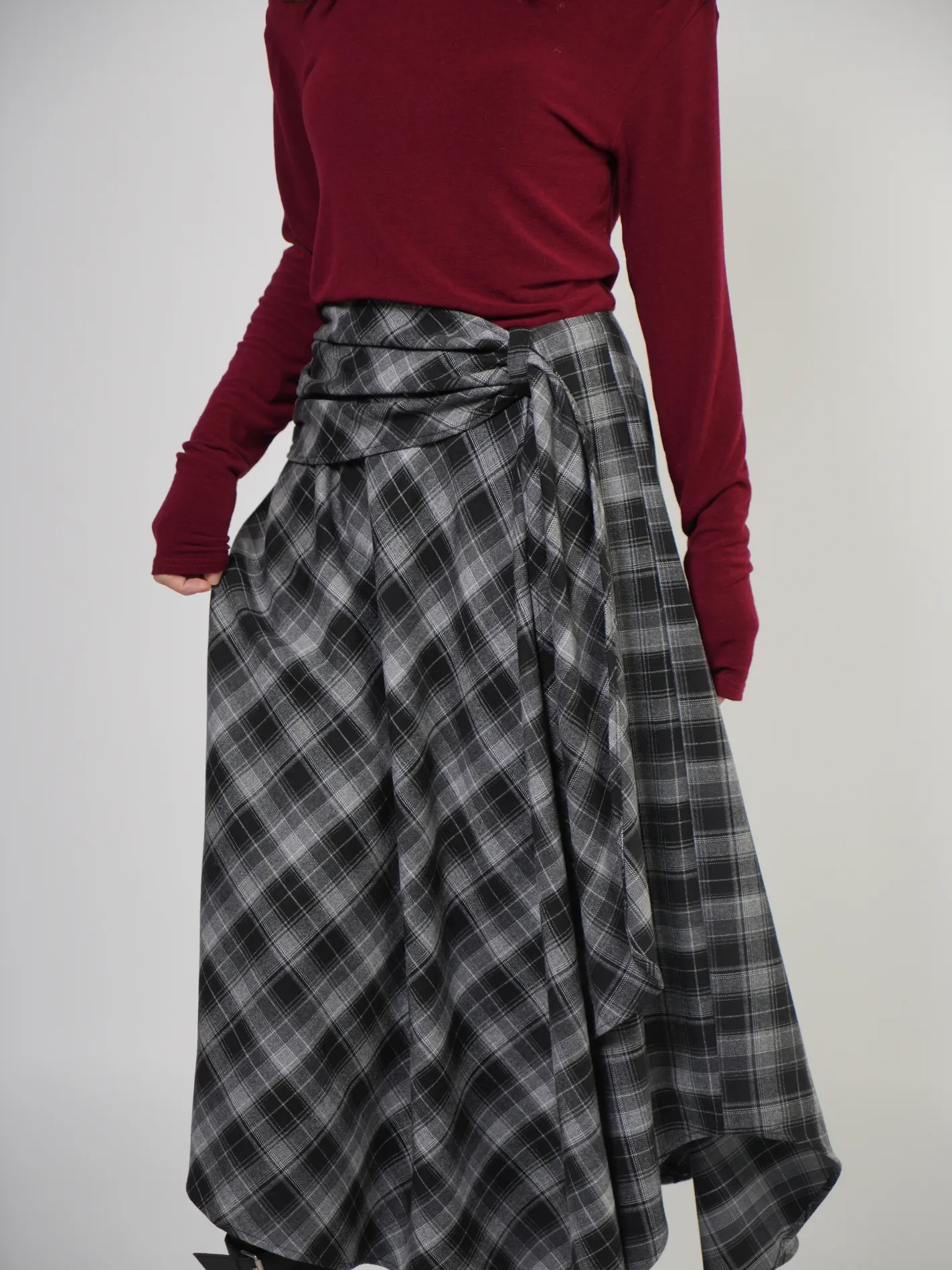(現貨)綁腰設計格紋不規則長裙(黑)