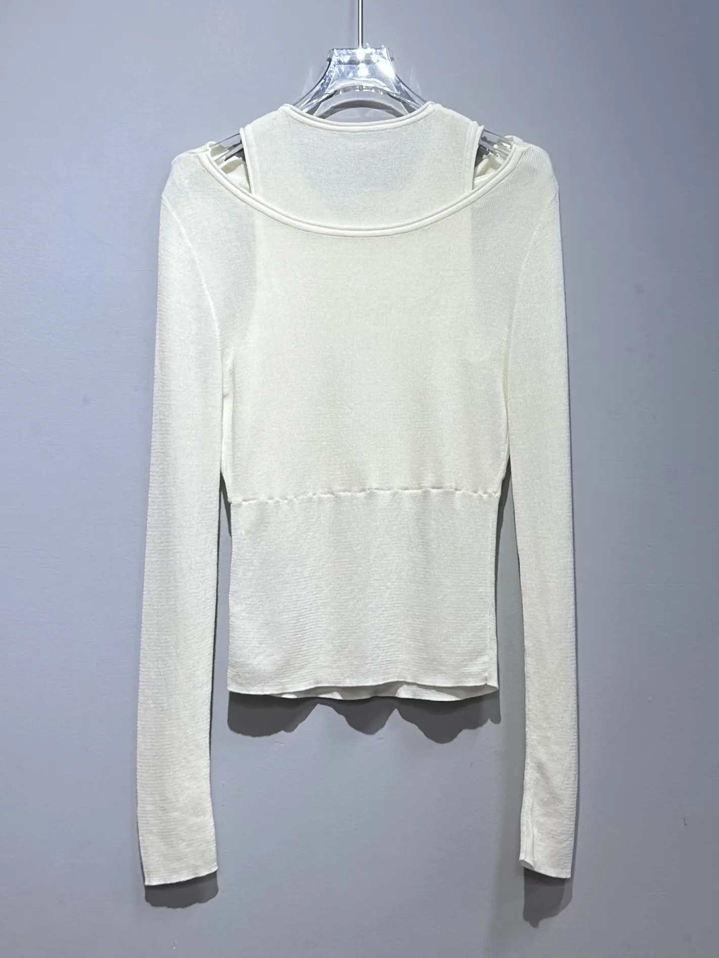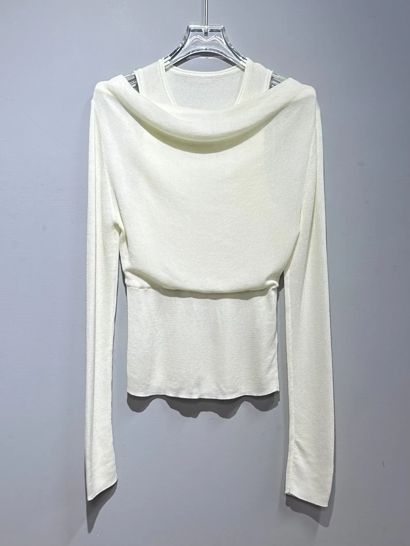 極輕柔!天絲霧感假兩件露肩上衣(杏)